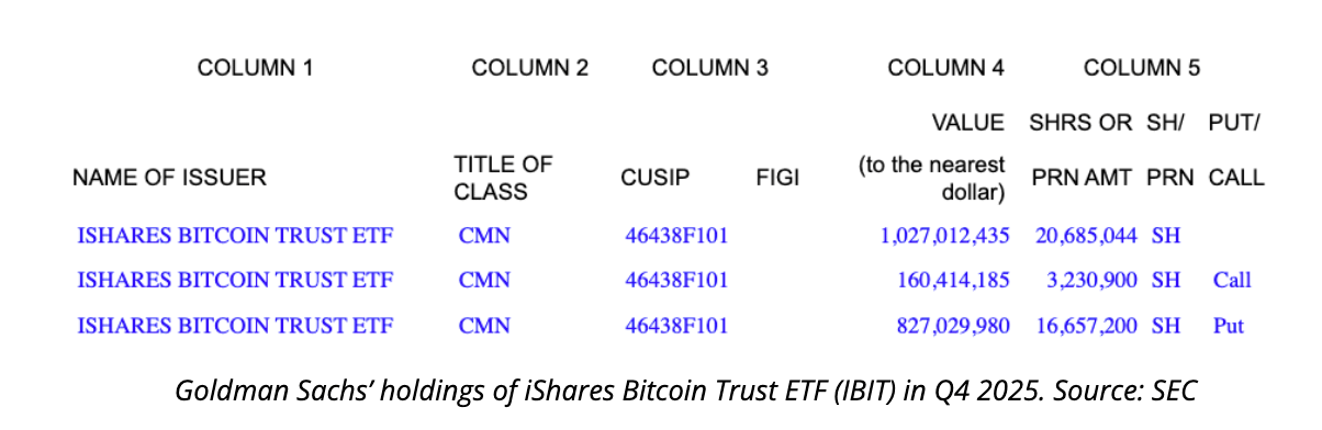 Institutional strategies are also evolving. Goldman Sachs recently filed a Form 13F with the U.S. Securities and Exchange Commission, revealing a reduction in its exposure to Bitcoin ETFs during the fourth quarter of 2025. The financial institution decreased its holdings in BlackRock”s iShares Bitcoin Trust (IBIT) by 39%, dropping the number of shares outstanding from approximately 34 million in Q3 to 20.7 million in Q4, with a valuation near $1 billion. Additionally, Goldman trimmed its positions in other Bitcoin-linked products, including Fidelity”s Wise Origin Bitcoin Fund (FBTC) and various Ether ETFs.