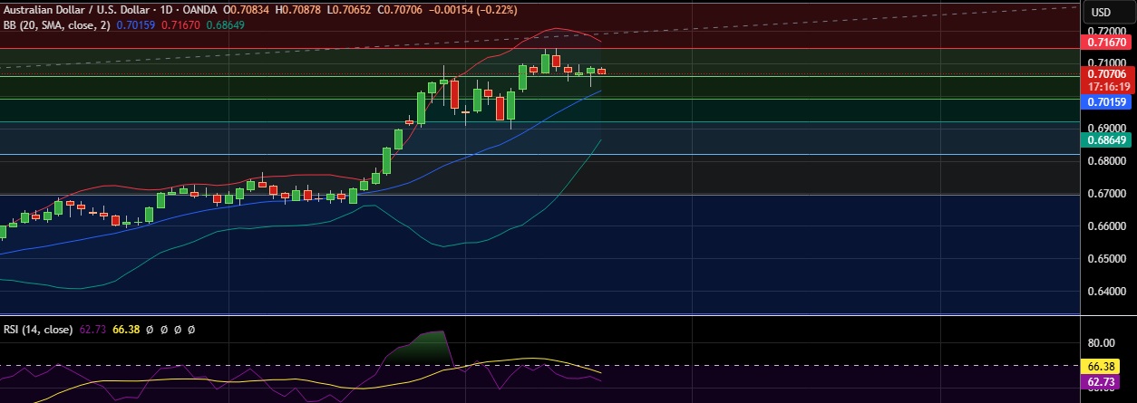 In terms of technical analysis, immediate resistance for AUD/USD is identified at 0.7144, corresponding to the 23.6% Fibonacci retracement level. A sustained close above this level could propel the pair towards 0.7169, which aligns with the upper Bollinger Band. Conversely, support is noted at 0.7060, the 38.2% Fibonacci level, and a break below this could see the pair drop to 0.7019, which is the 20-period simple moving average.